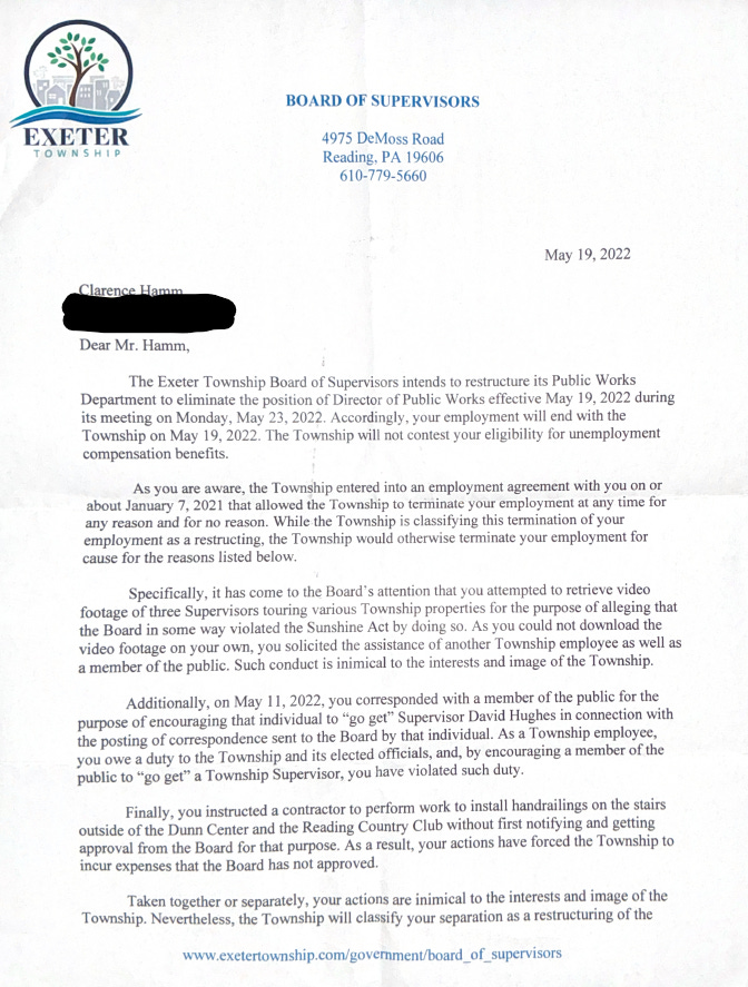 The letter goes on to state that he’d enlisted the aid of a resident to “get” one of the Supervisors. “Additionally, on May 11, 2022, you corresponded with a member of the public for the purpose of encouraging that individual to "go get" Supervisor David Hughes in connection with the posting of correspondence sent to the Board by that individual. As a Township employee, you owe a duty to the Township and its elected officials, and, by encouraging a member of the public to ''go get'' a Township Supervisor, you have violated such duty.” That citizen is believed to be Vinnie Biancone, with whom Hughes had a contentious relationship. Early in Hughes’ Supervisory career, he published threatening emails on his personal blog, exeterunited.com, from Biancone that were sent to Hughes’ Exeter Township email address.