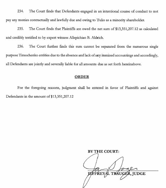 Timochenko controlled financing, overhead allocations, interest calculations, and final financial decisions. The partnership eventually collapsed under mounting disputes over overhead charges, interest calculations, and profit distributions. According to court findings, Tulio was at various points informed that he had been overcharged interest by approximately $1 million, only to later be told he owed $900,000 after internal reassessments.